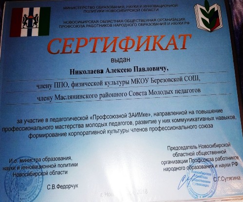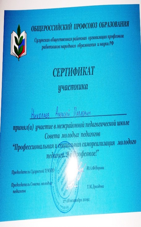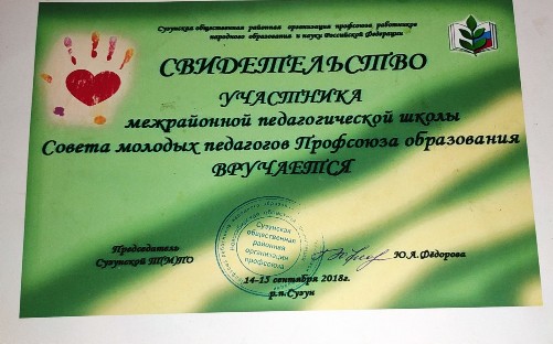 | Сертификат участника в межрайоной педагогической школе совета молодых педагогов |