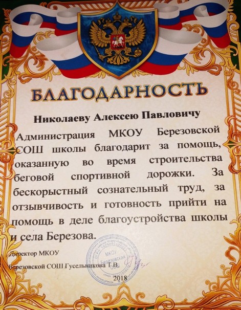 | Благодарноть за помощь в строительстве беговой дорожки |