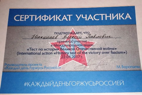 | Сертификат участника между народной акции :"Тест по истории ВОВ" |